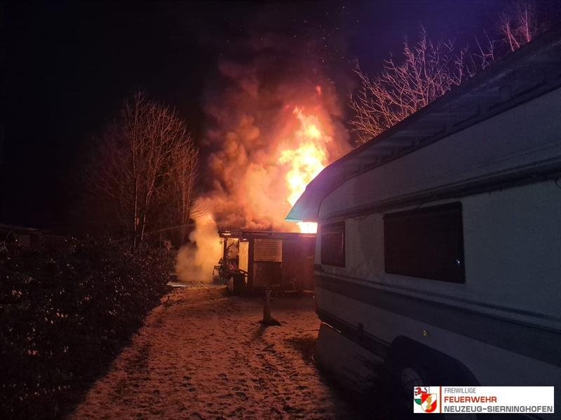 Beim Eintreffen des Rüstlöschfahrzeuges der FF Neuzeug-Sierninghofen stand ein Wohnwagen samt Anbau bereits in Vollbrand. Die Besitzerin des Wohnwagens befand sich im Bereich der Zufahrt zum Grundstück und wurde zur weiteren medizinischen Betreuung dem Roten Kreuz übergeben.