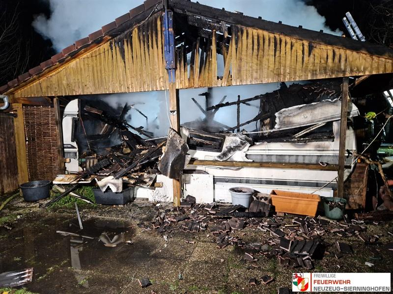 Beim Eintreffen des Rüstlöschfahrzeuges der FF Neuzeug-Sierninghofen stand ein Wohnwagen samt Anbau bereits in Vollbrand. Die Besitzerin des Wohnwagens befand sich im Bereich der Zufahrt zum Grundstück und wurde zur weiteren medizinischen Betreuung dem Roten Kreuz übergeben.